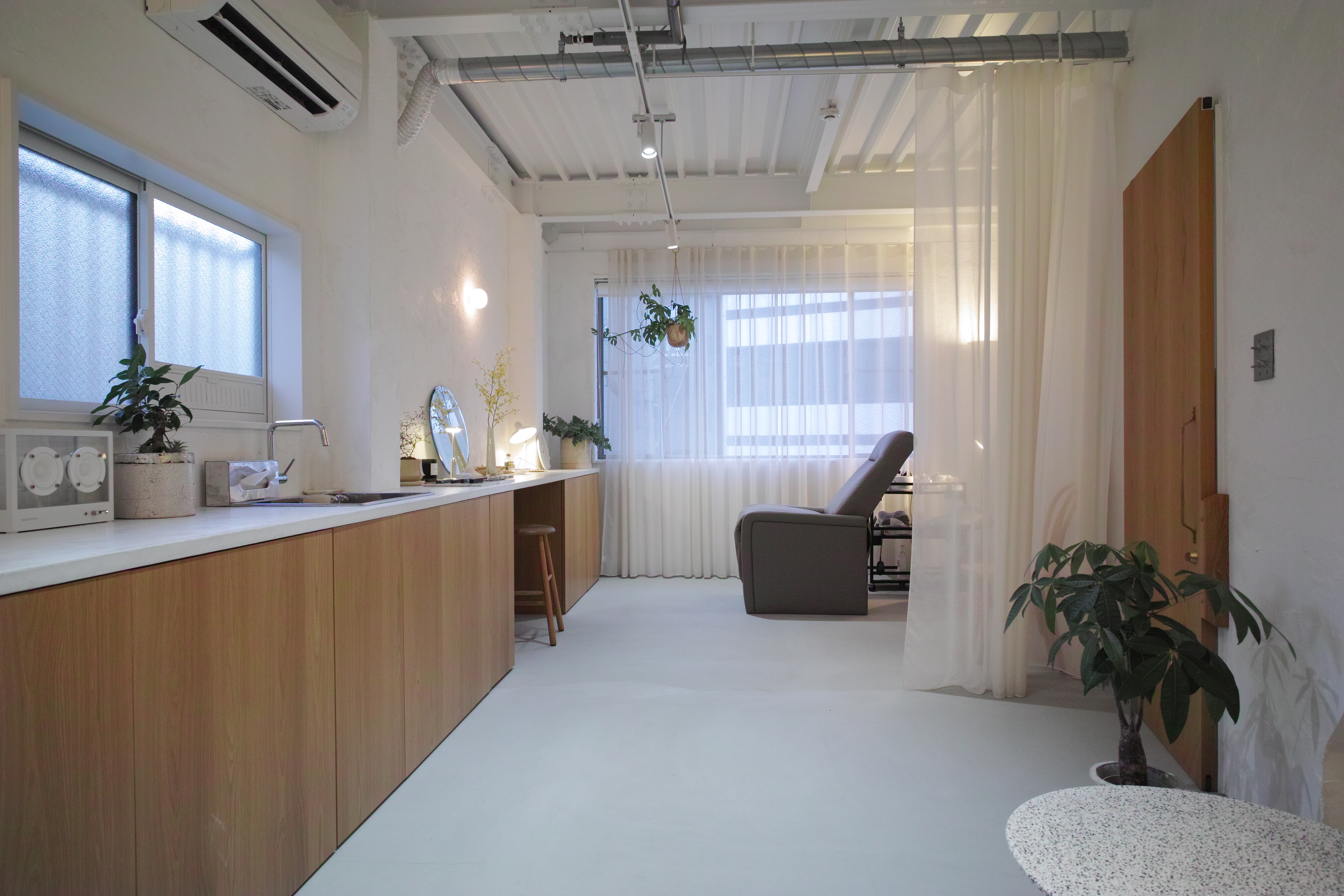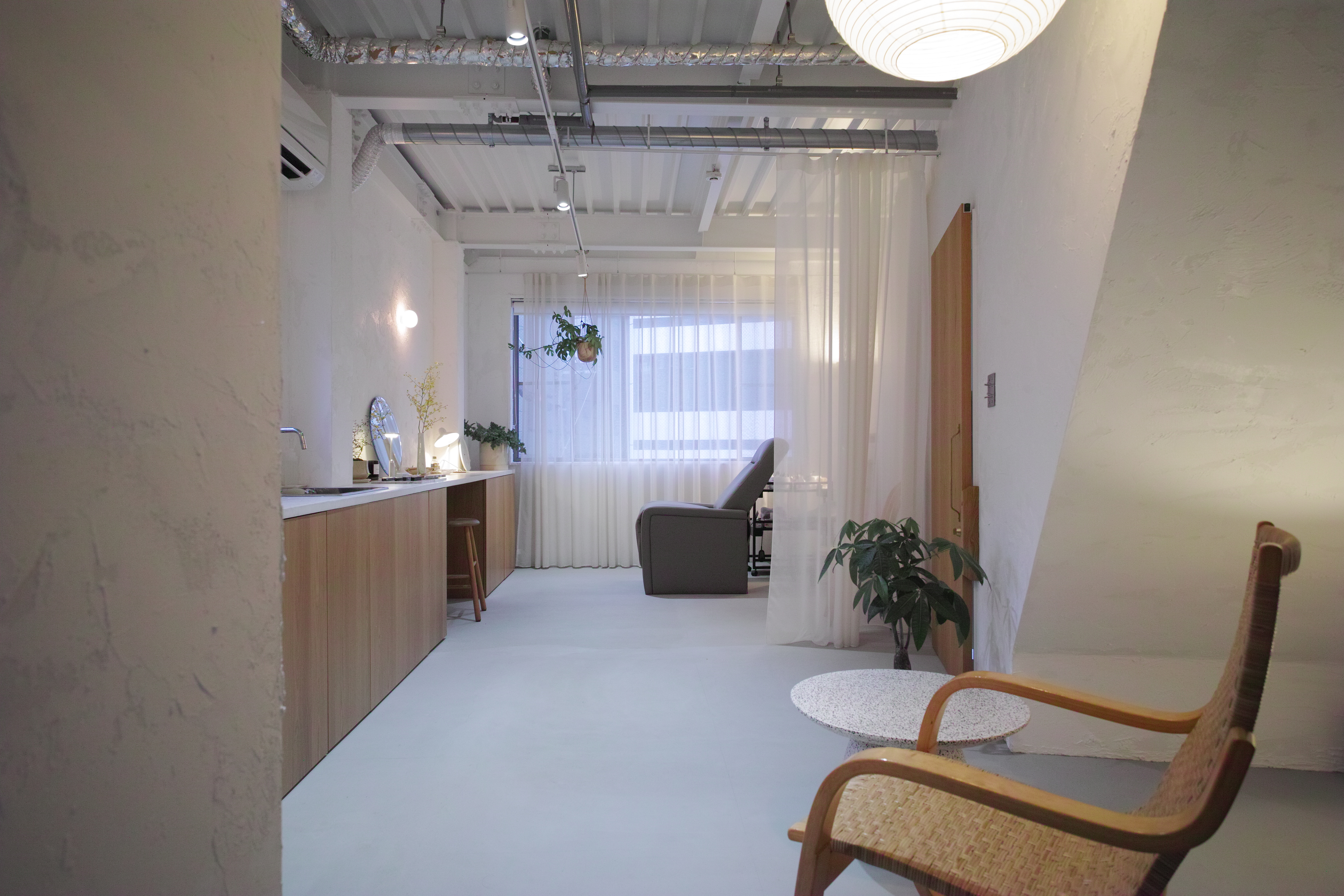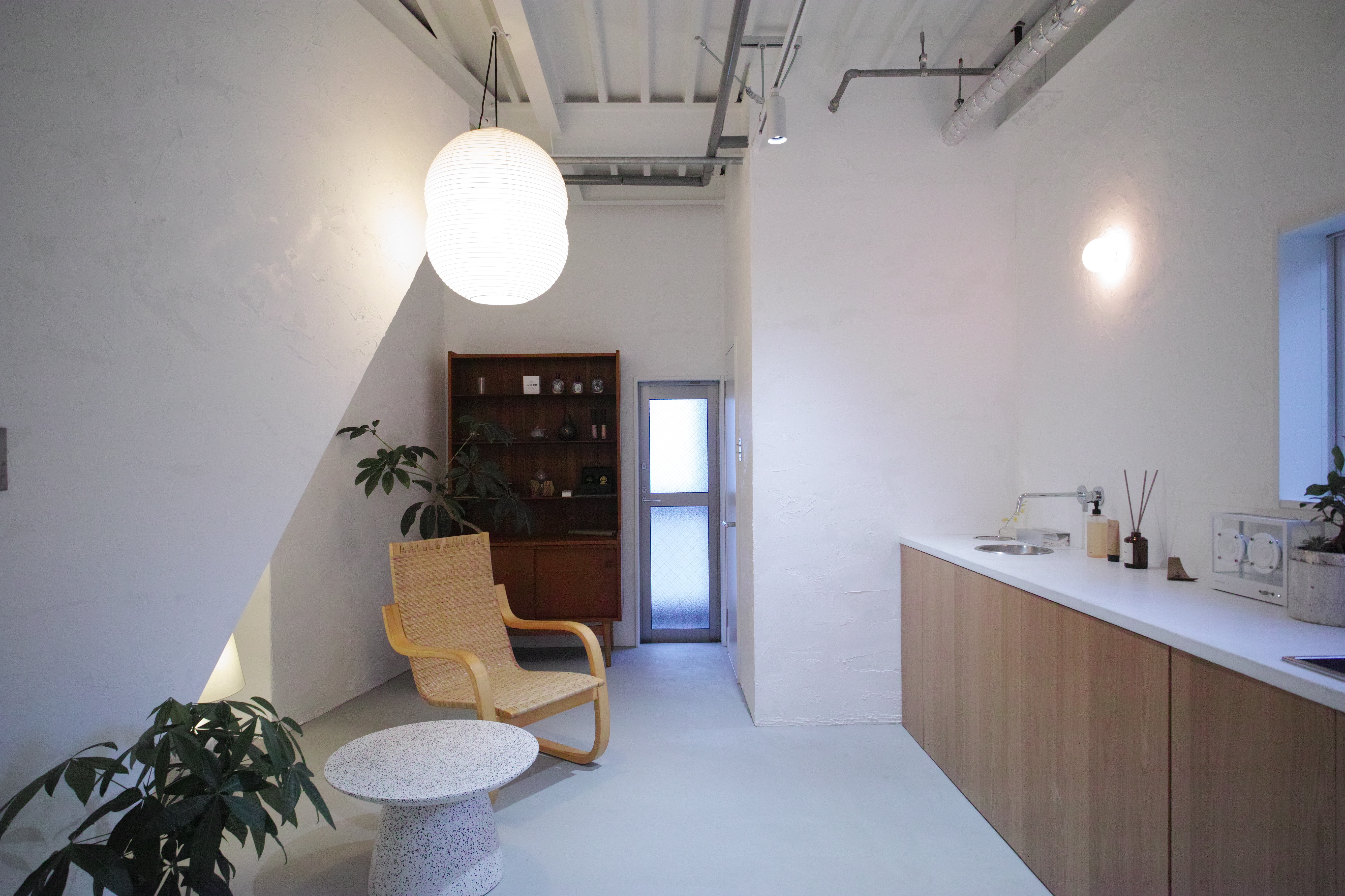 金沢市中心地の3階建てビルの2Fワンフロアをリノベーションしました。20帖ほどの空間を全て鉄骨表しとして空間を最大限広げつつ、白を基調とした内装と落ち着きのある照明計画で居心地の良いアイラッシュサロンを目指しました。所々に散りばめられた北欧家具と空間の調和を考えました。