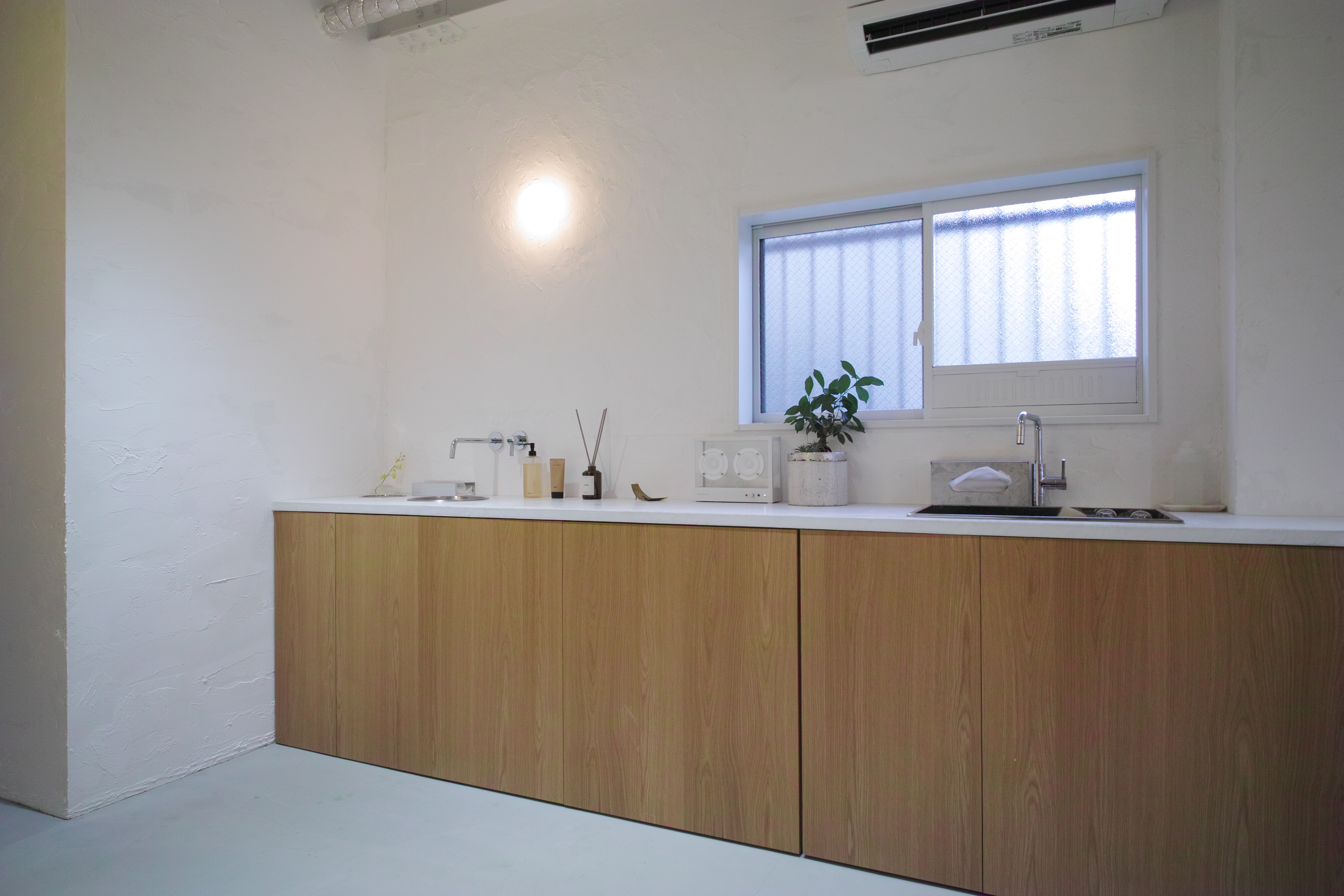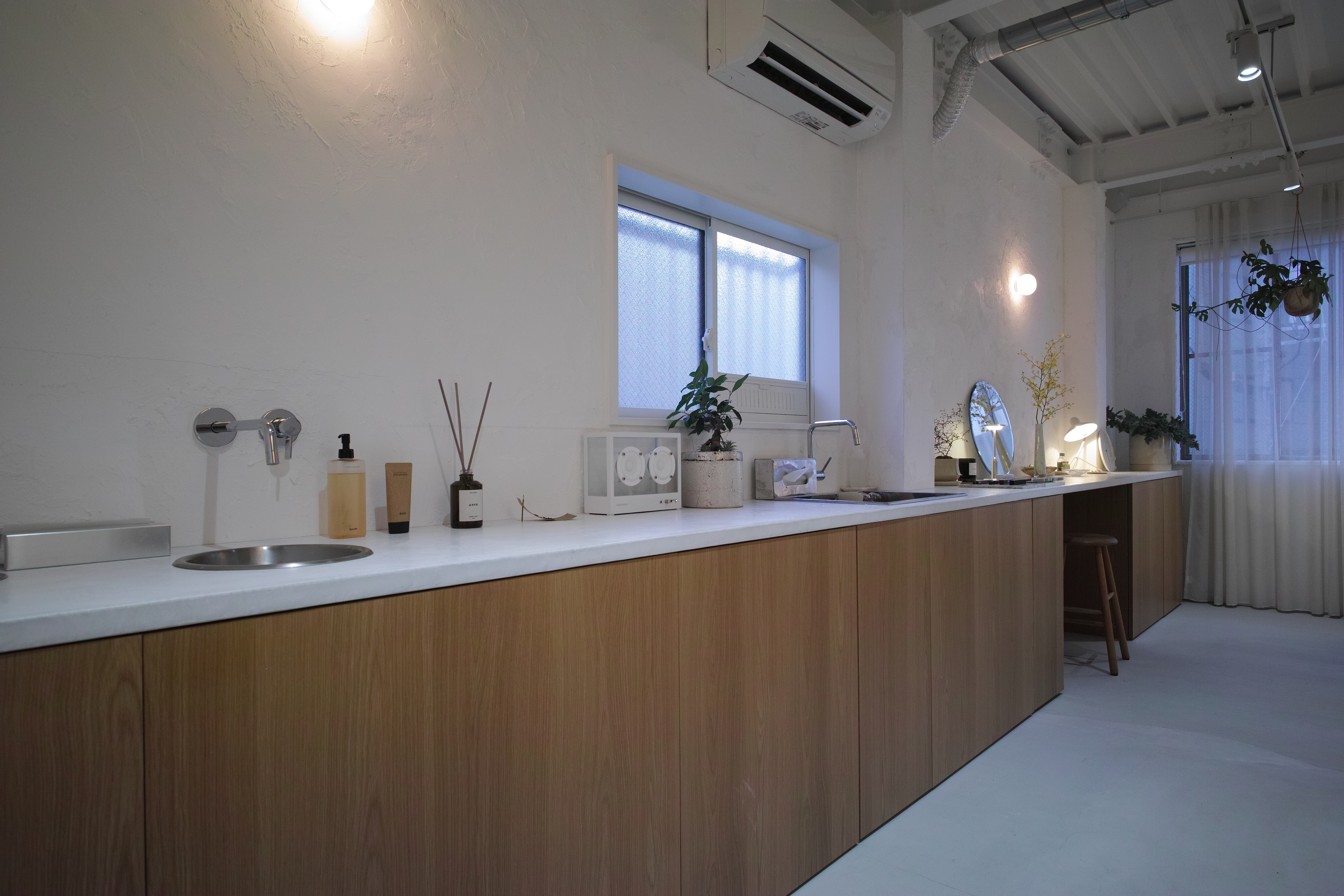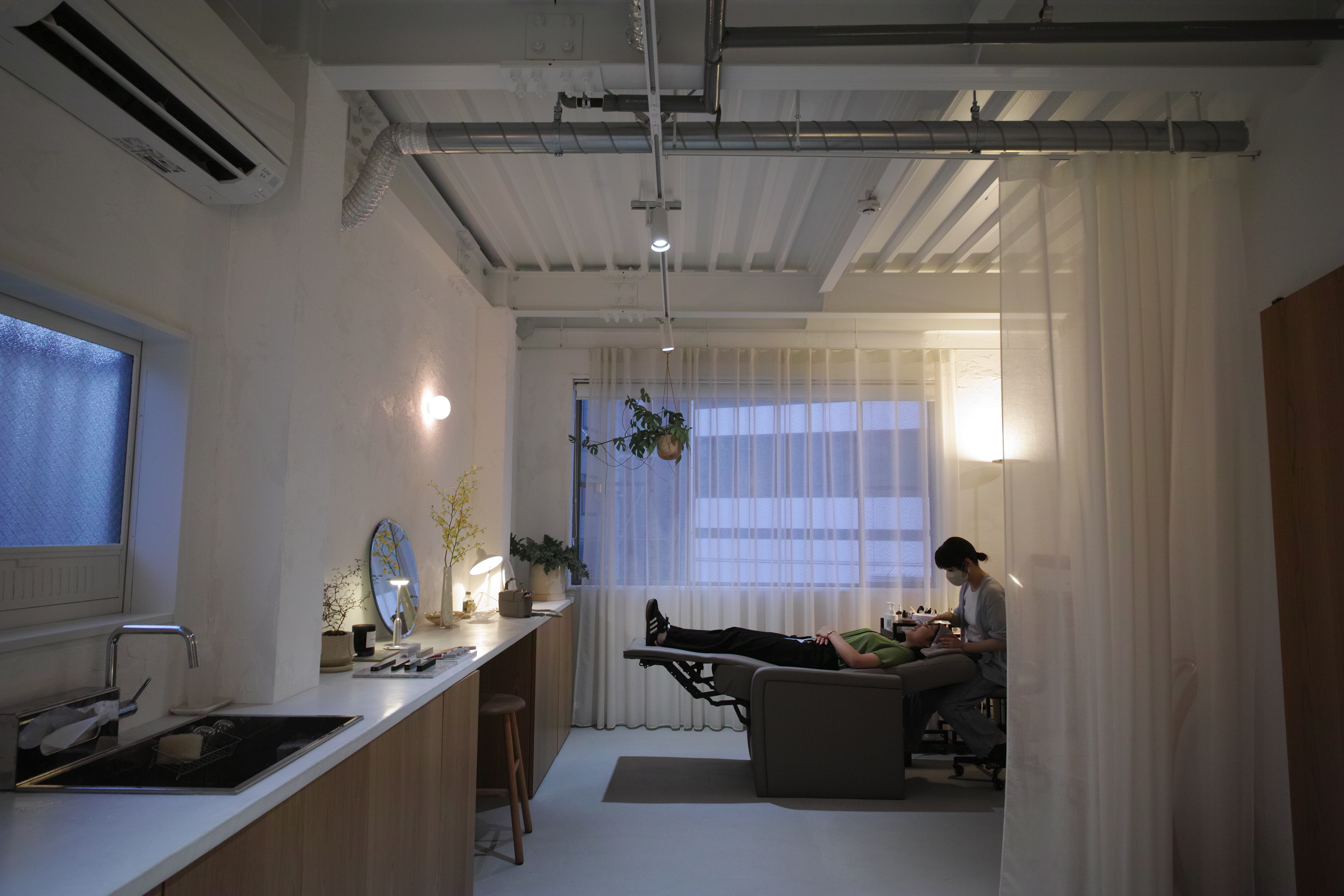 金沢市中心地の3階建てビルの2Fワンフロアをリノベーションしました。20帖ほどの空間を全て鉄骨表しとして空間を最大限広げつつ、白を基調とした内装と落ち着きのある照明計画で居心地の良いアイラッシュサロンを目指しました。所々に散りばめられた北欧家具と空間の調和を考えました。