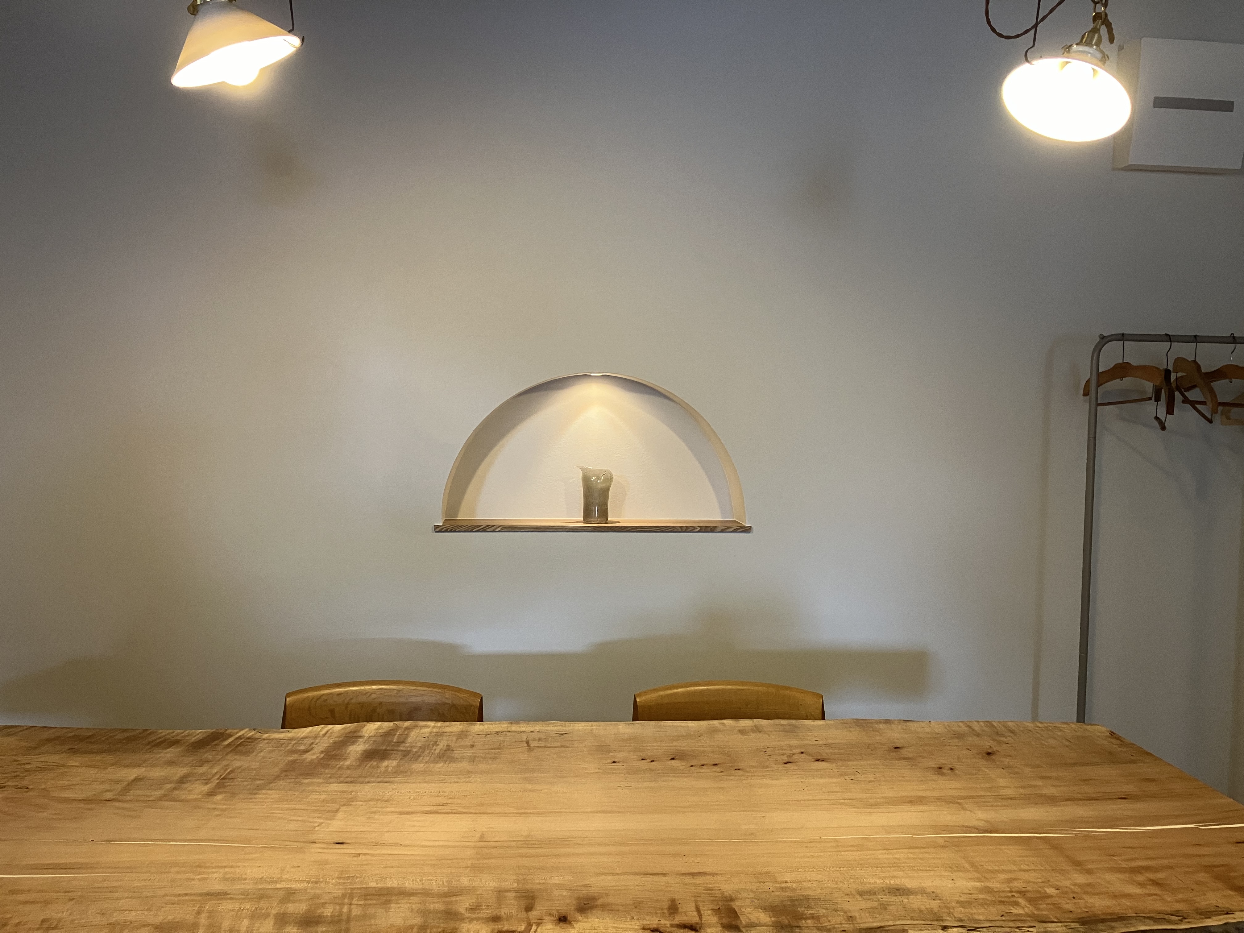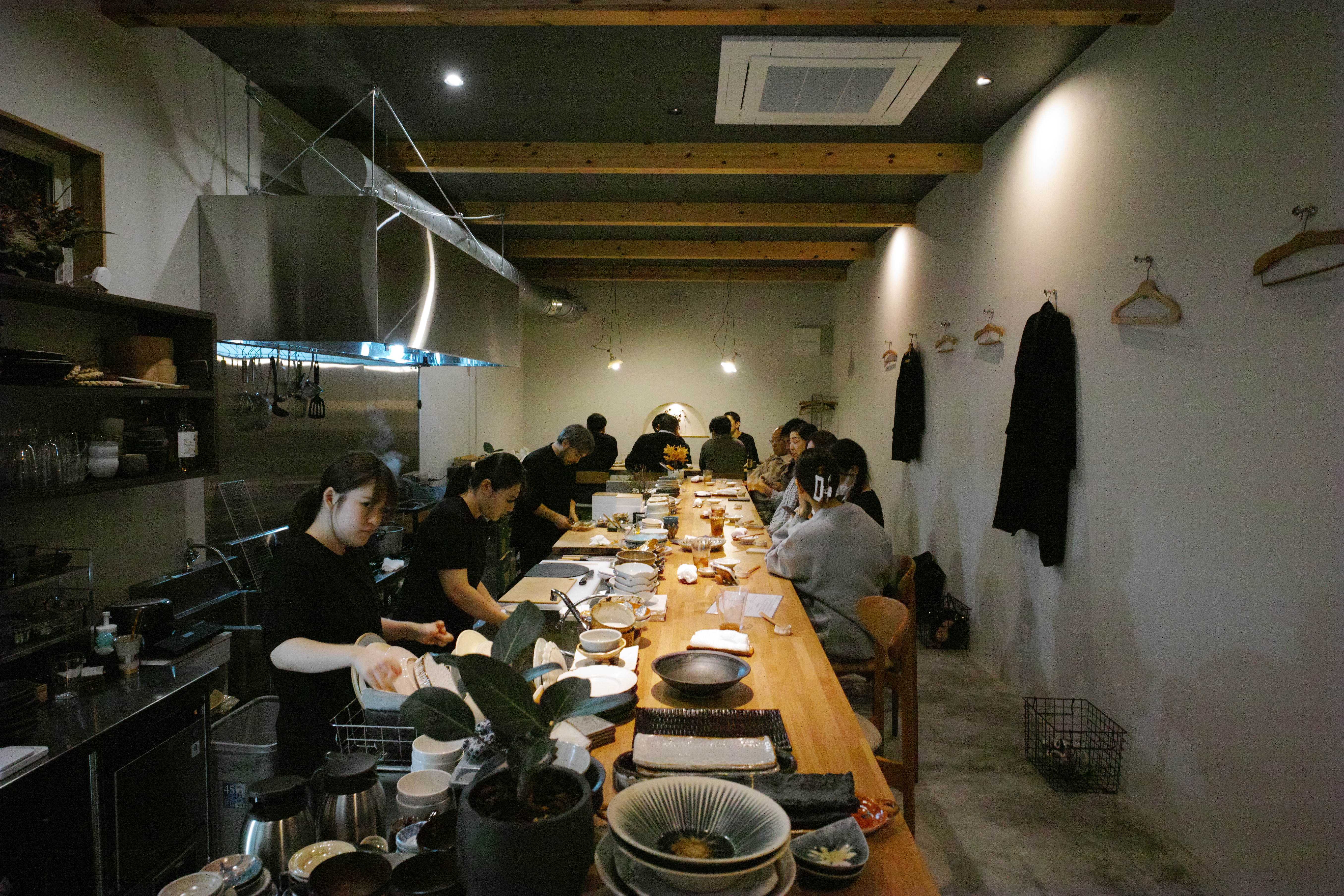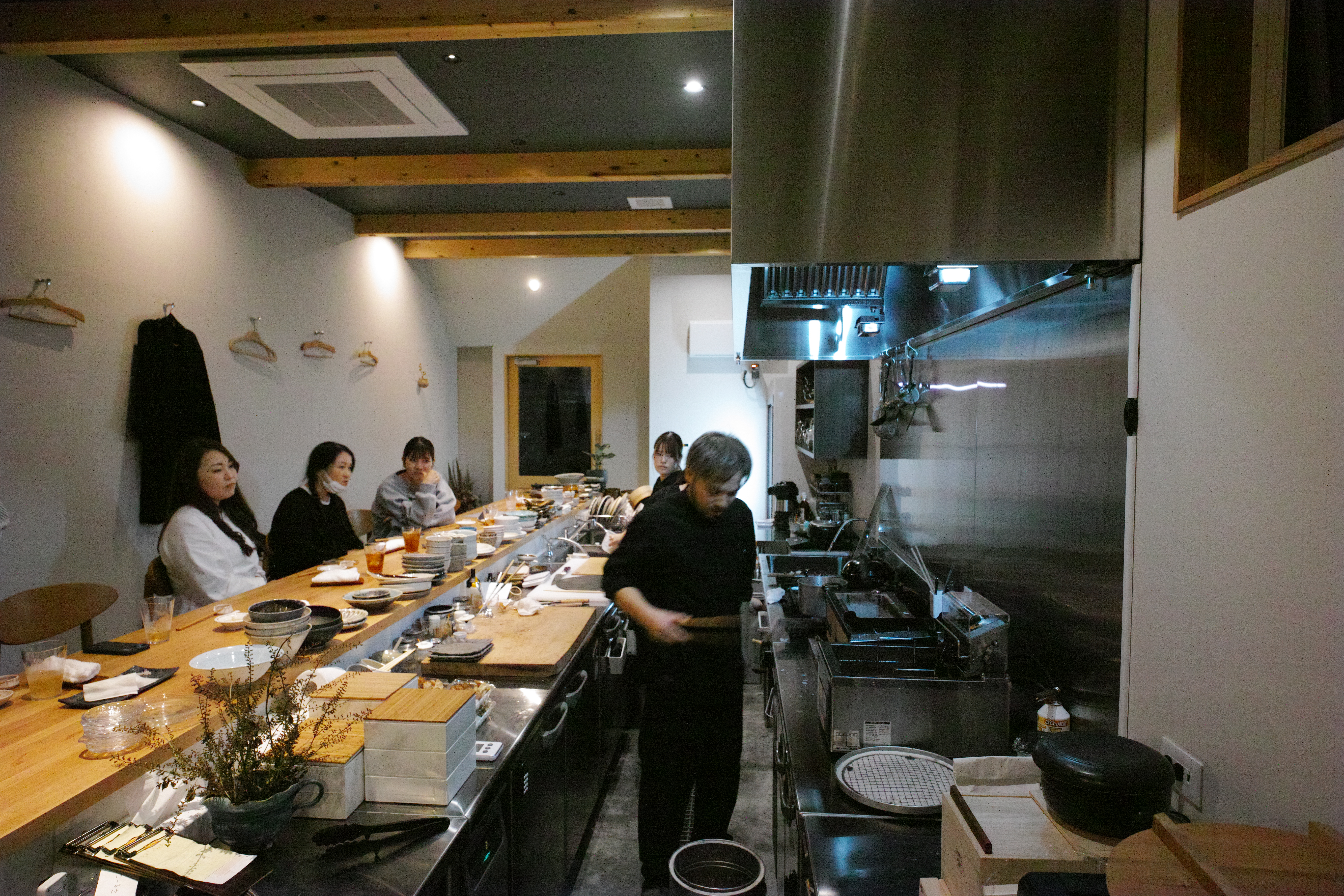 白山市郊外に構えた小料理屋。オーナーのつながりで見つけた空テナントはスケルトンから内装をリノベーションした。断熱、空調、内装、厨房機器、家具などをトータルプロデュース。カウンターをメインとして客席と厨房の距離が近くオーナーとの心地よい会話が愉しめるようなフロアレベルとした。大きなカウンターには料理を彩る小皿が並べられこの店の主役を飾る。厨房が見え一品一品の料理を作る工程を感じながら至福の一杯が心を満たす小料理屋として計画しました。